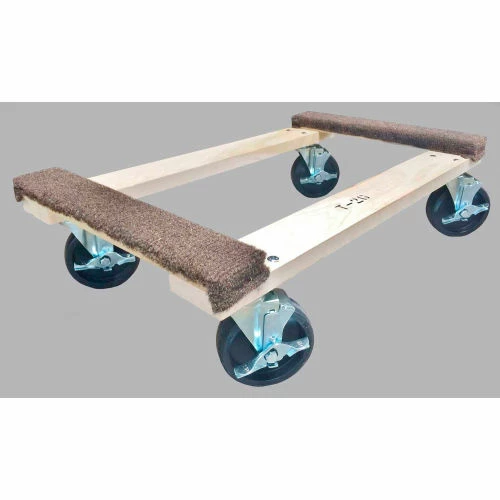 Carpeted open deck Poplar hardwood dollies are made of high quality materials for long lasting durability and dependability. Carpeted Deck provides load stability and abrasion resistance. Includes 5″ Polyolefin rubber casters with footbrakes.