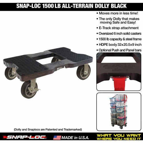 The only Dolly that makes moving enjoyable with easy rolling 1500 lb capacity, optional E-Strap attachment and the versatility to transform into a Push Cart and Panel Cart. Moving your stuff has never been so easy! E-Strap attachment provides the ability to stack more on the Dolly and straps can be used as load control handles Safely Moving More in Less Time! Includes a fully integrated steel frame with four built in SNAPLOCS (E-Track Single strap anchors), ball bearing 6 inch all-terrain solid rubber casters (2 fixed, 2 swivel with brake) and flat top cargo grip pads. Dolly body and pads are made from long lasting heavy duty Polypropylene and measures 32″x20-1/2″x9-1/2″ tall. Optional powder coated steel bars allow for easy conversion into a Platform Truck or Panel Cart. Best of all, the Snap-Loc Dolly is Made in USA for that Ultimate Cargo Control! Snap-Loc also offers a variety of System Accessories, SNAPLOCS E-Track Singles and Straps for most every type of application.